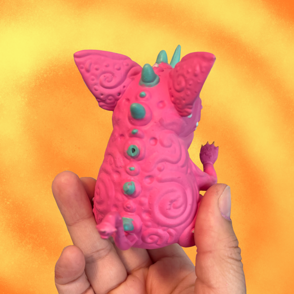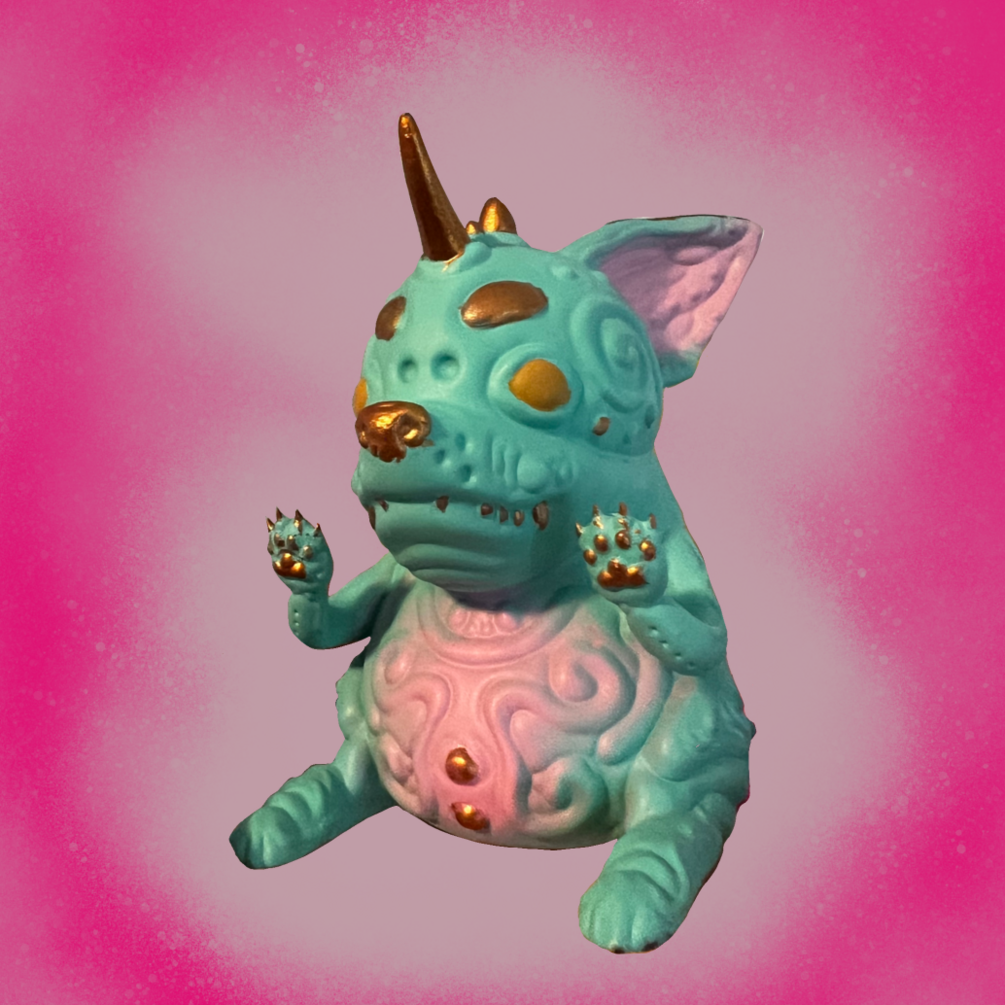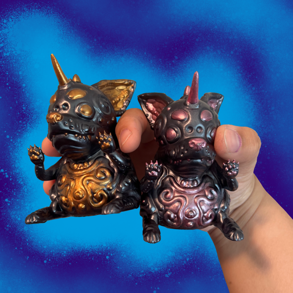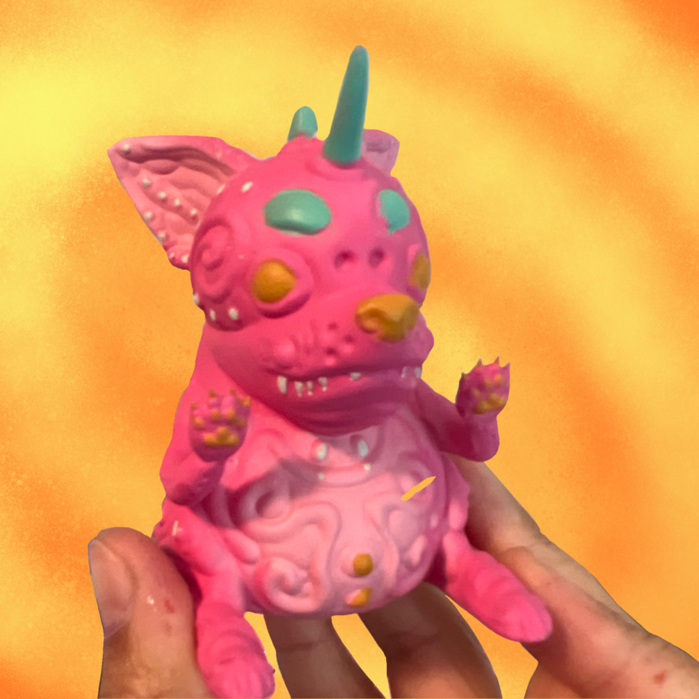 This is a designer toy that comes in a 5 inch cubed box and comes in 5 colors: blue, pink, metallic gold, metallic pink, and gold. This is a preorder and the final toy will be shipped out on or by September first