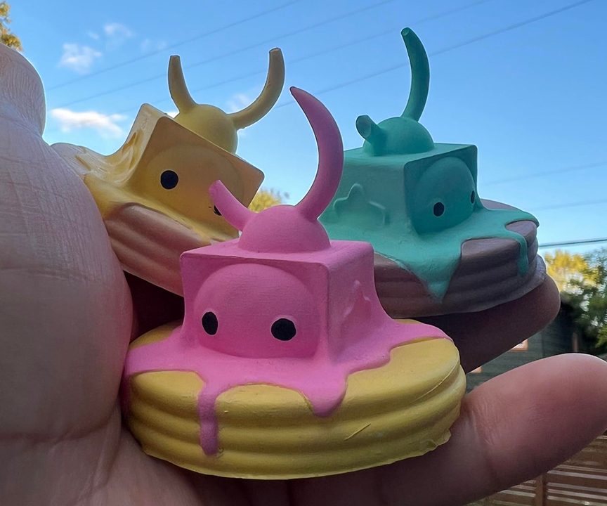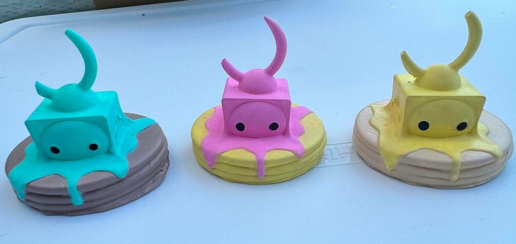 When the QT-TVs came down to Earth they transformed into the forms of their favorite things such as fruits, minerals, and other assorted shiny things. When Pancake came down to Earth they hung out in diners and decided to transform into its favorite food!